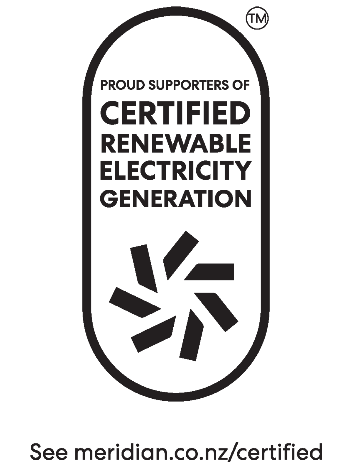 We’re proud to support 100% renewable energy generation by purchasing Meridian’s Certified Renewable Energy product. This means that most of the electricity we get from the grid in New Zealand is matched on an annual basis by an equivalent amount from Meridian’s hydro stations or wind farms, which are independently verified as producing 100% renewable electricity.